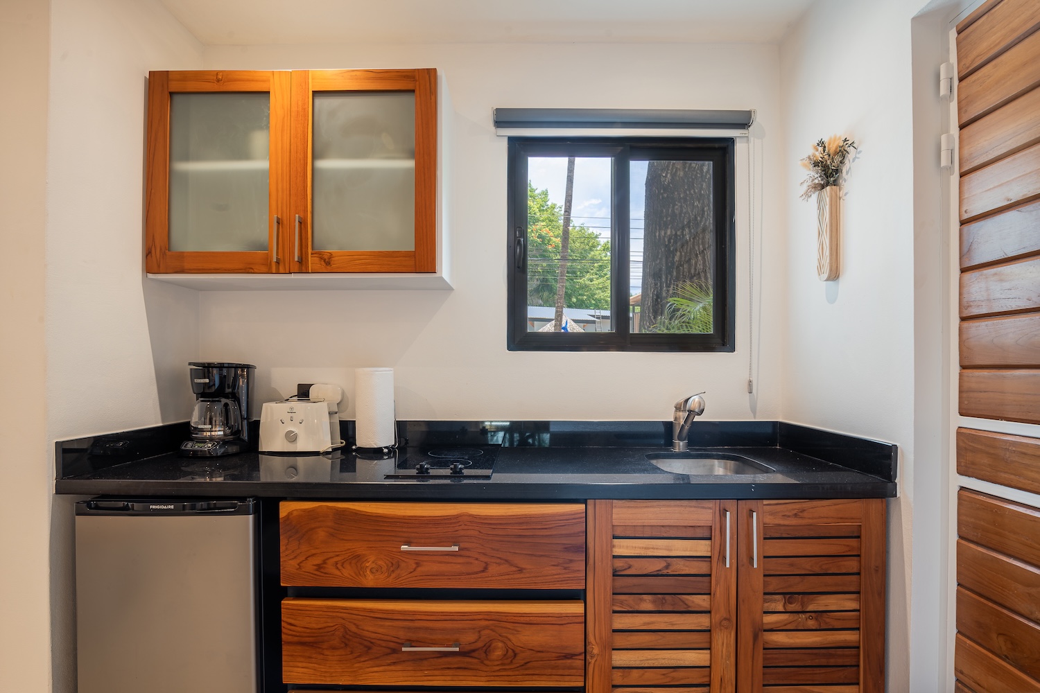 Plantara is a two-story structure with the upper floor being two identical fully furnished one-bedroom apartments. The lower level contains two identical studio apartments. Each of the four apartments has its own entrance, and privacy that you can’t get at a hotel, while providing the amenities at you’re your fingertips.
